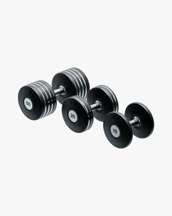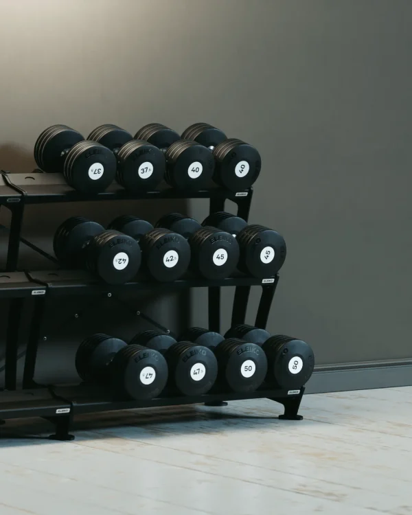 Eleiko Plate Dumbbells improve the lifting experience with a sloped dumbbell head that is more comfortable on the wrists and forearms and when resting dumbbells on the thighs. The smooth handle rotation places less stress on the joints in training. Smart modular construction allows facilities to tailor their dumbbells with a broader range of available weights.
