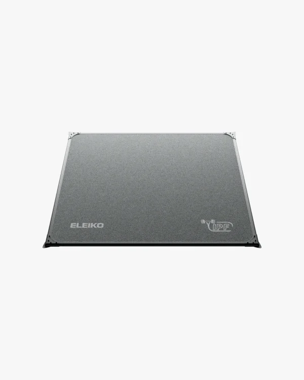 Eleiko Powerlifting Warm-up Platform features a sleek curved frame, a layer of rubber tiles to dampen sound and vibration, and an engineered textile stretched across the surface. The joint-free construction ensures a flat lifting surface, and the textile provides optimal grip during lifts.