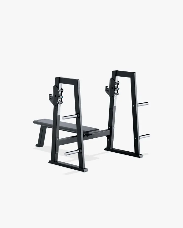 The Eleiko Olympic Flat Bench combines user friendly features with smart details to ensure safety and minimize maintenance. It is designed to perform a variety of bench press exercises from a flat bench position. The bench features ten height adjustments for the bar hooks so users can find a comfortable starting and ending position. Adjustment positions are numbered on both side of the uprights so lifters can easily confirm their position. The hooks feature built-in polyurethane rollers to protect the bar knurling and allow lifters to adjust the bar while loaded for optimal positioning. The integrated weight storage pins keep weights close at hand and the lifting area clutter free. If extra stability is needed, the bench can be bolted to the ground using the hidden bolt holes in the frame.