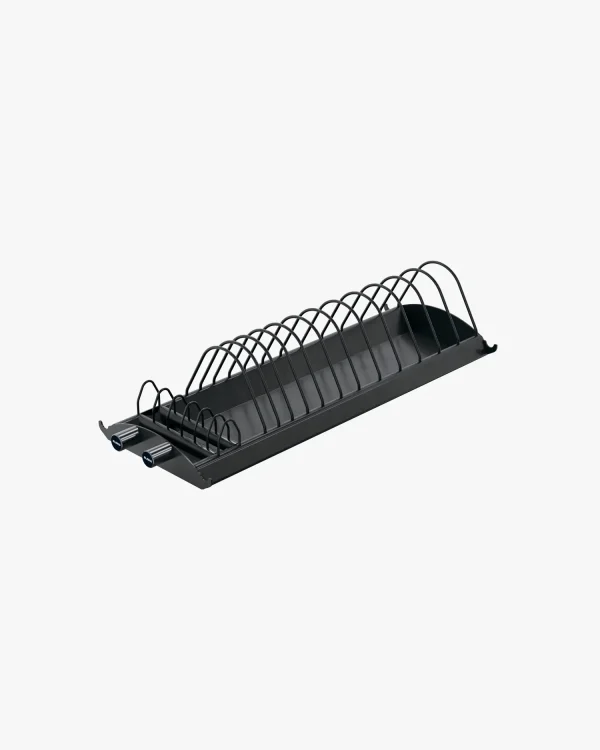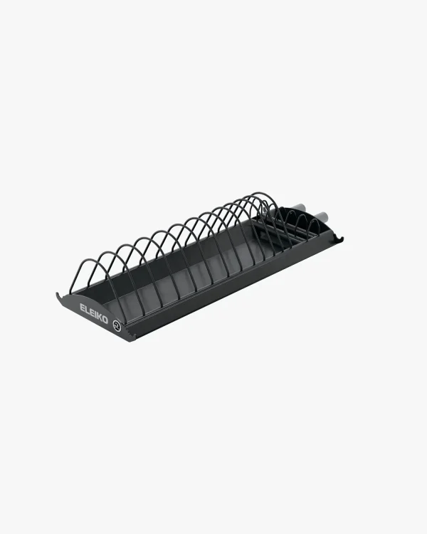 The Eleiko WPPO Powerlifting Warm up/Training Plate Rack features a new modern design profile and conveniently stores plates and collars for use when lifting in competition warm up and training halls. The base construction and shape of the plate dividers make handling, unloading and re-racking plates easier. The design facilitates systemized plate storage as each slot is sized specifically to accommodate the differing plate widths ensuring a secure fit and that weights are stored in the appropriate spot. The rack holds four 25 kg, two 20 kg, two 15 kg, four 10 kg, two each of the 5 kg, 2,5kg, 2kg, 1,5kg, 1kg, 0,5kg and 0,25 kg PL metal plates, as well as a pair of collars.