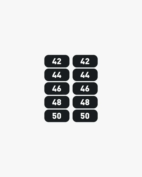 Order these Eleiko Weight Number Decals in the ranges and weight markings to meet your needs. The decals help ensure dumbbells are racked in the right place, keeping training spaces tidy and organized. The decals are available in kg and lb ranges that match our Eleiko Evo and Plate Dumbbell weight increments. Eleiko Pro Dumbbell shelves feature a recessed spot designed to house and protect the laminated decals. They can be used on both versions of the Eleiko Dumbbell shelves and fit on the front face of the kettlebell shelf. These decals are an add-on and need to be purchased separately in quantities that are appropriate for your needs.